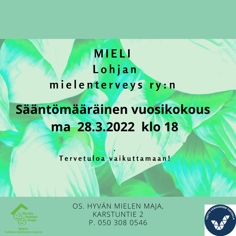 Mieli Lohjan mielenterveys ry:n sääntömääräinen vuosikokous 28.3.2022 klo 18. Tervetuloa!